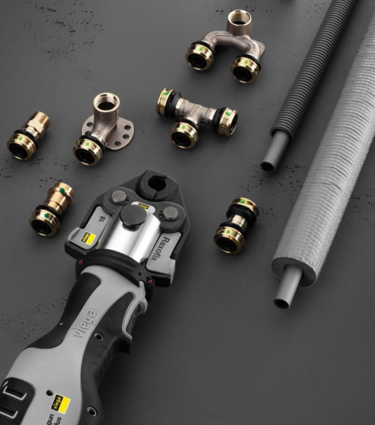 Note: The Raxofix press connector system is suitable for potable water installations according to DIN 1988-200 and EN 806-2, considering material selection in accordance with DIN EN 12502-1 and the evaluation basis for metallic materials in contact with potable water issued by UBA (Federal Environment Agency). For other applications or if in doubt about correct material selection, please contact Viega.